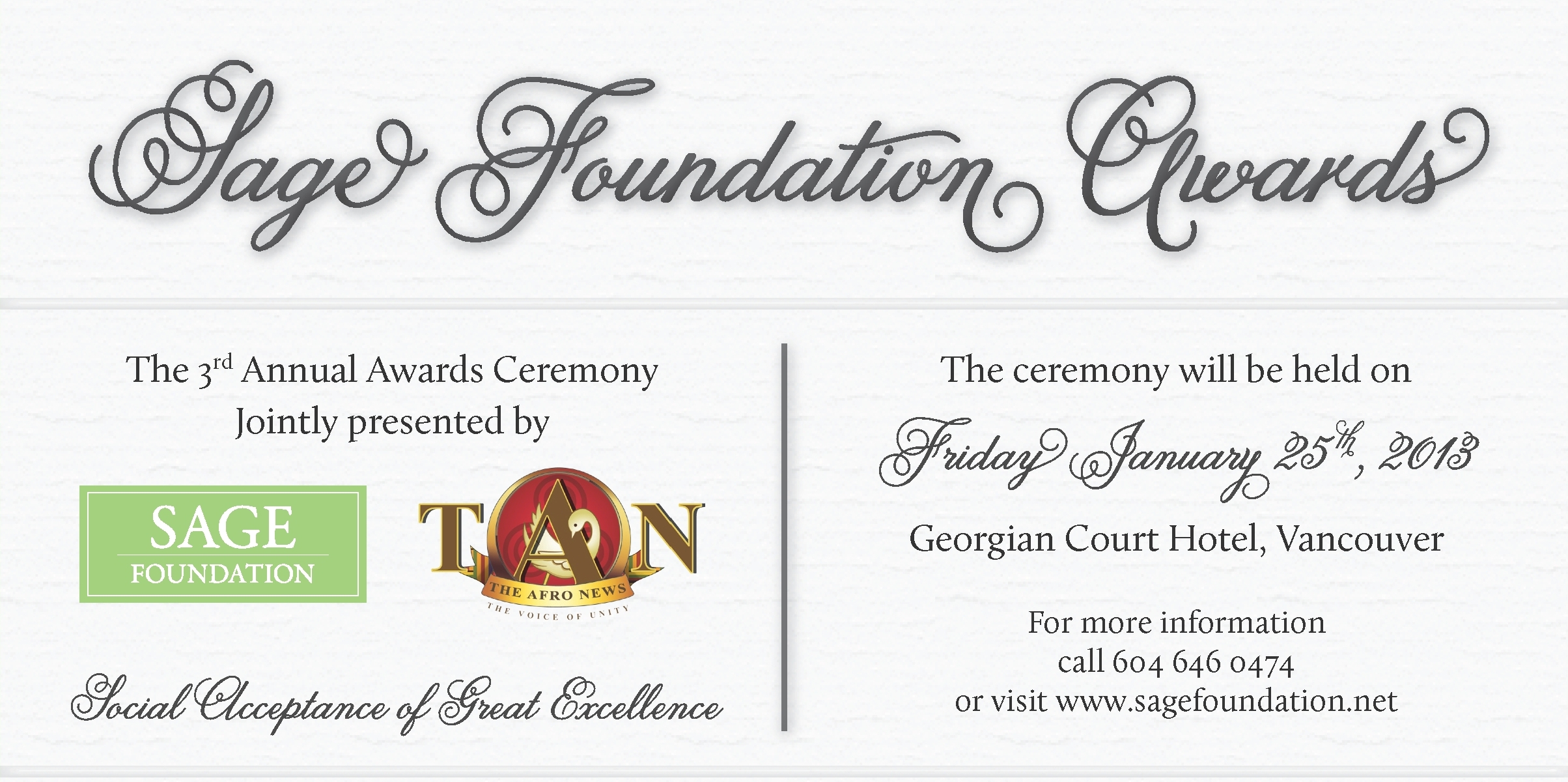 For more information call 604 646 0474 or visit www.sagefoundation.net
